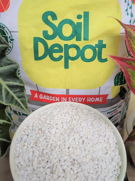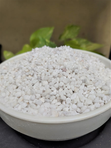 An inorganic material made from volcanic glass manufactured to puff like popcorn. It is used to improve soil aeration, keeping it loose and well-draining.
